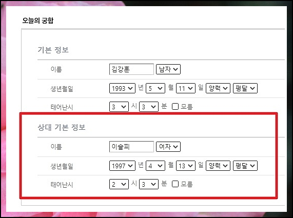 궁합의 현대적 버전인 "이성과의 오늘 하루" 서비스를 이용해 보세요. 이것 또한 무료 보기 가능한 것인데요, 해당 서비스를 이용하기 위해서도 상대와 나에 대한 몇 가지 정보를 입력해야 합니다. 결과는 현대식으로 깔끔하게 나와 있습니다. 특히 상대방과의 관계 해석을 점수로 표현한 것은 정말 훌륭하다고 생각해요. 이를 통해 나와 상대방의 관계를 쉽게 이해할 수 있습니다.
