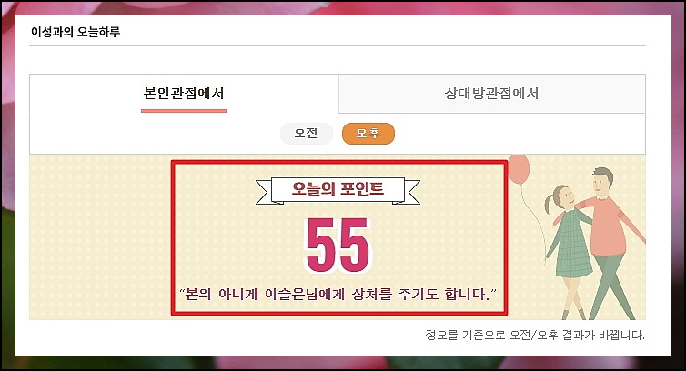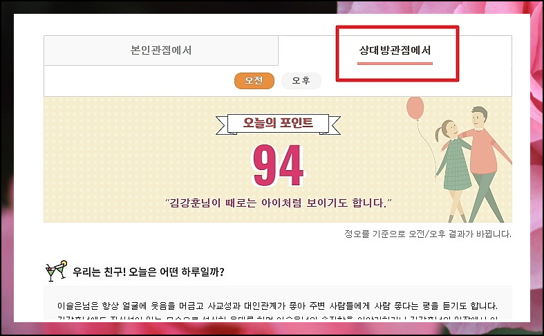 상대방이 관점에서 보는 것도 가능한데요, 관계라는 것이 관점에 따라서 달라질 수 있습니다. 그렇기 때문에 본인과 상대방 관점, 이렇게 두 가지 풀이를 보여 주는 것으로 보여요. 포함하지 오늘 하루에 대하여 오전과 오후, 이렇게 두 가지로 나눠서 풀이 결과를 보여줍니다. 생각보다 꽤 깊이 있는 역술임을 알 수 있어요.