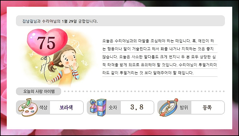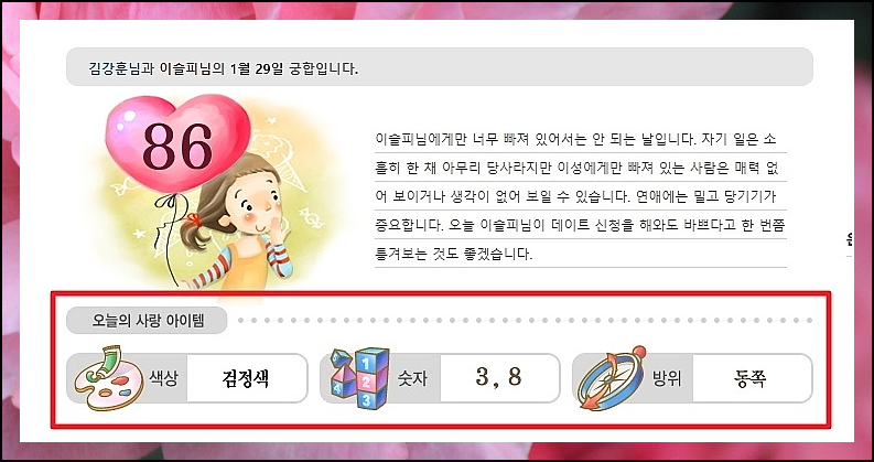 그 다음으로 보면 좋은 것이 "오늘의 궁합"입니다. 이 경우에는 상대방의 성함과 생년월일, 태어난 시각을 정확하게 알아야 합니다. 그래야 정확한 결과를 얻어낼 수 있죠. 정보를 입력한 후 결과 보기 버튼을 누르면 이와 같은 화면이 나타나는데요, 앞서 언급한 바와 같이 사랑 아이템 내용이 포함되어 있어서 데이트에 사용하기에 정말 좋습니다.