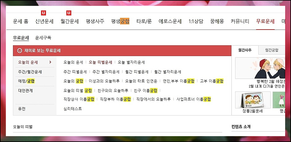사이트에 접속하면 메뉴에서 무료 운세를 클릭해 보세요. 그럼 20가지 정도 되는 역술 서비스가 나타납니다. 여기에서 세 번째 카테고리에 있는 서비스를 살펴보세요. 일별로 볼 수 있는 것은 물론이고, 이성뿐만 아니라 부부, 고부, 직장, 상사 등 다양한 인간관계에 대한 해석을 살펴볼 수 있도록 되어 있습니다.