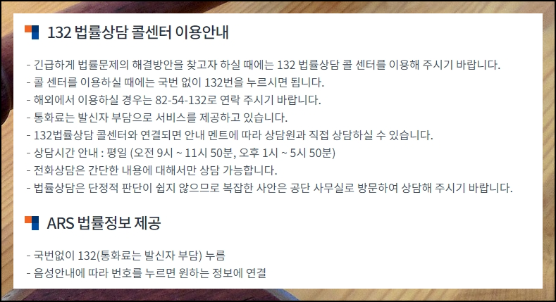 여러 공공기관에서는 국민의 생활 편의를 의해 다양한 무료 서비스를 제공하고 있습니다. 그 중에 하나로는 무료법률상담 서비스인데요. 전화번호를 눌러 진행하는 콜센터는 기본이고, 인터넷을 이용한 사이버 방식, 화상 통화 방식, 직접 전문가와 대면하는 방문 방식을 제공하고 있습니다. 우선적으로 긴급하게 도움을 받고 싶을 때 누르면 되는 전화번호를 알려드릴게요. 바로 "132번"인데요. 해외의 경우에는 "82-54"를 앞에 붙여야 합니다.