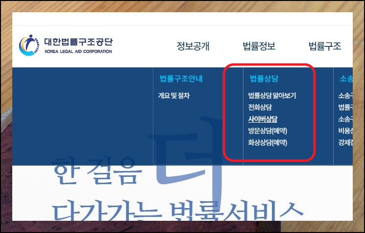안내 문구를 보셨는지 모르겠지만, 통화료는 발신자 부담입니다. 이러한 비용이 부담스럽다면 사이버 법률상담 서비스를 이용해 보세요. 제가 이용 방법을 알려드릴게요. 사이버 방식 외에 화상 방식이나 방문 방식도 함께요. 그럼 일단 법률구조공단 사이트에 접속해 주세요. 사이트에 접속하면 메뉴에서 [법률상담] 카테고리가 있습니다. 제가 언급한 방식이 모두 나와 있는데요. 여기에서 [사이버상담]을 선택하면 됩니다.