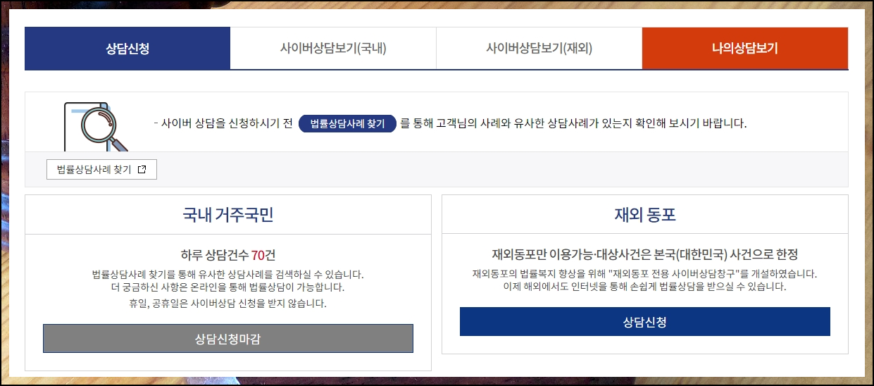 사이버 방식의 경우에는 하루에 70건의 제한이 있습니다. 휴일과 공휴일에는 신청을 받지 않는다는 점도 기억해 주세요. 또 한 가지 팁을 드리자면, [법률상담사례 찾기] 서비스가 제공되고 있습니다. 풍부한 상담사례 자료를 살펴볼 수 있는 서비스인데요. 본인과 유사한 사례가 있는지 확인하는 것도 좋은 방법입니다.