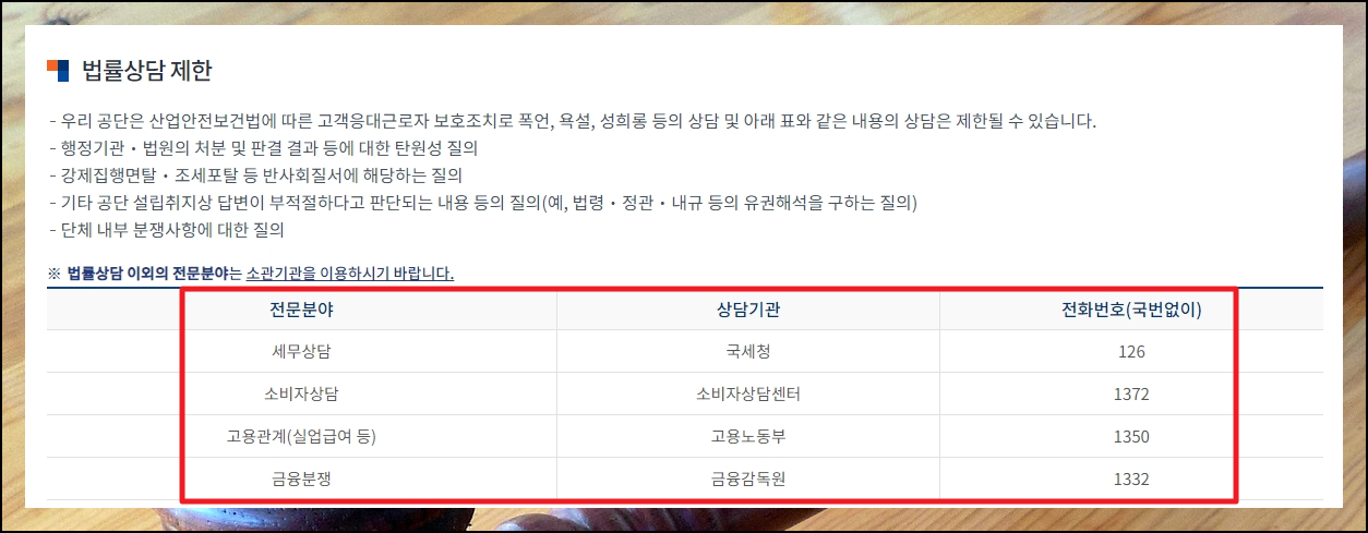 부료법률상담을 진행할 때 아셔야 할 점이 있습니다. 고객응대근로자 보호에 방해 되는 일을 절대 하면 안되고, 이곳에서 다루는 부분에 대해서만 진행을 할 수 있습니다. 세무, 소비자, 고용관계, 금융분쟁에 관련된 것이라면 그에 응대하는 기관이 있으니 이를 참고하시길 바랍니다. 기관명과 전화번호를 알 수 있는 표를 아래에 첨부했으니 이용해 보세요.