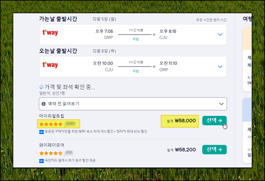 항공편 선택 이후에는 다음과 같이 제주 비행기표 예약을 진행할 업체 및 사이트를 선택해야 합니다. 평점, 제시하는 티켓 금액, 할인 및 혜택이 표시되어 있으니 이를 참고하여 하나 선택해 주세요. 여기서 [선택] 버튼을 누르면 해당 포스팅에서 가장 처음에 보여드린 예약 페이지가 열립니다. 예약 페이지에서는 안내에 따라 탑승자 정보를 입력하고, 비행기표 요금을 결제하면 됩니다. 티켓 사는 법이 어렵지 않기 때문에 사이트에서 안내하는 데로 진행하면 됩니다.