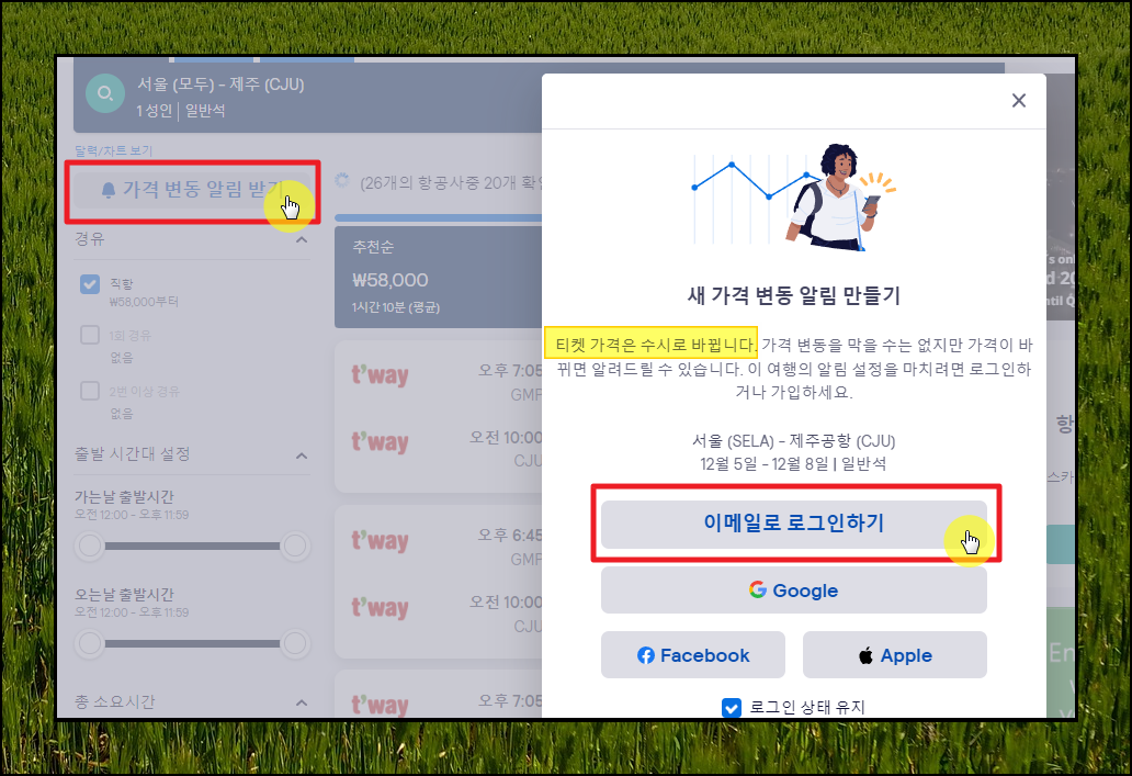구글, 페이스북, 애플 아이디를 이용한 간편 로그인을 할 수 있어서 편하게 진행 가능합니다. 해당 기능을 사용한 후, 알림이 오면 그때 제주 비행기표를 예약하면 됩니다.
