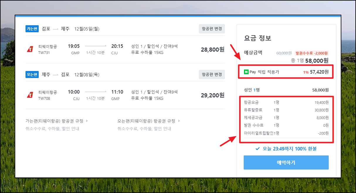 제가 방금 찾아본 바에 의하면 김포에서 제주로 가는 왕복 항공권을 57,420원에 구매가 가능하였습니다. 이 가격은 항공요금, 유류할증료, 발권 수수료, 제세공과금이 모두 포함된 가격입니다. 온라인 상에서 바로 예약할 수 있고, 예약 후 당일 23시 49분까지 100% 환불도 가능하기 때문에 더 저렴한 티켓을 찾는 데에 큰 도움이 됩니다.