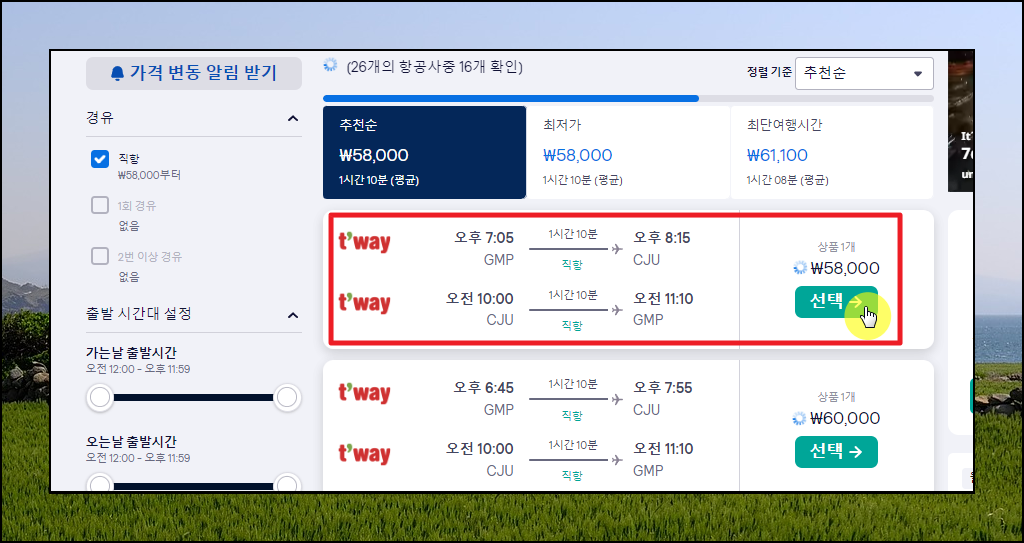 여객기를 탑승할 날짜를 정했다면 이번에는 출발 시간대와 더불어 항공편을 선택할 차례입니다. 사람이 몰리는 시간대를 선택하는 경우 티켓 가격이 올라갈 수 있습니다. 정말 싸게 제주 비행기표를 사고 싶다면 다음과 같이 오후에 출발해서 오전에 돌아오는 항공편을 이용하면 됩니다. 좌측에 보면 출발 시간대 설정을 할 수 있는 기능이 있는데요. 여기서 시간대를 조절하면 해당 조건에서 가장 싸게 파는 항공편을 찾을 수 있습니다. 선호하는 항공사와 마음에 드는 출발 시간대를 기준으로 항공편 리스트에서 하나 골라 [선택] 버튼을 클릭해 주세요. 그럼 바로 예약 진행이 가능합니다.