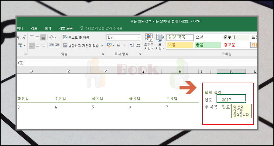 달력이 들어 있는 엑셀파일이 열렸습니다. 오른쪽 상단에 있는 '달력 설정'을 보시면 '연도'와 '주 시작'이 보이시나요? 여기를 원하는 값으로 입력하면 됩니다. 2024년 달력을 찾고 있었으니 '2024'을 입력하고, 일주일에 시작하는 요일은 '일요일'로 정하였습니다.