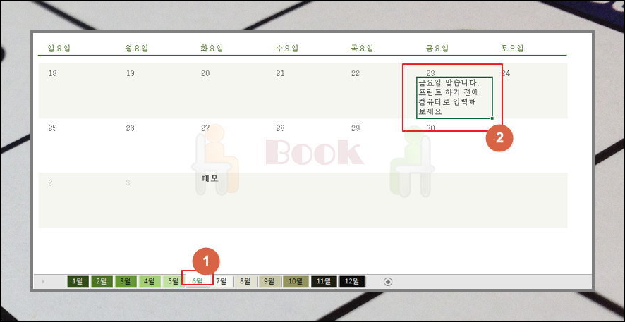 2024년으로 설정한 값이 적용되었는지 확인해보겠습니다. 오늘은 2024년 6월 23일 금요일입니다. 시트에서 6월을 누르고, 23일을 찾아보니 23일로 되어 있네요. 위와 같이 다운로드 받은 파일이기 때문에 컴퓨터로 내용을 입력할 수도 있습니다. 프린트하기 전에 원하는 내용을 넣어보세요.