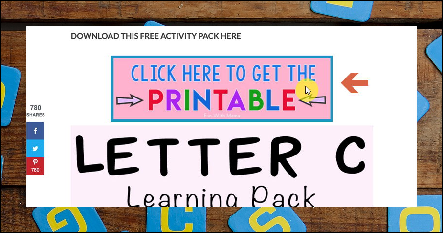 4. 학습 자료 활용법을 익혀요. LETTER C Learning Pack 게시물을 클릭했는데요. 여기서 다운 받은 것을 가지고, 어떻게 이용하면 좋은지 안내가 나와요. 설명을 쭉 읽으면서 스크롤을 내리면 다운로드 버튼이 있어요. 영어로 'Click Here To get The Printable' 이라고 되어 있는데요. 해당 버튼을 누르면 인쇄 할 수 있는 연습 자료를 내려 받을 수 있다는 의미에요.