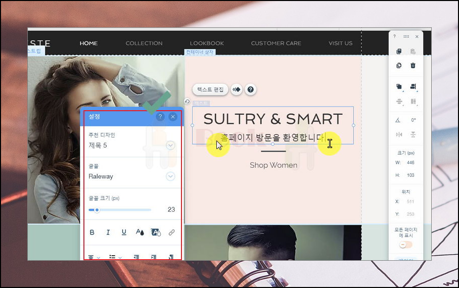 6. 마우스로 나만의 디자인 꾸며보세요. 지금부터 할 일은 꾸미기에요. 내 마음대로 사진이나 문구를 수정하면 돼요. 마우스로 클릭하면 바로 편집할 수 있도록 되어 있어요. 많은 디자인과 효과가 있기 때문에 멋지게 꾸밀 수 있어요.