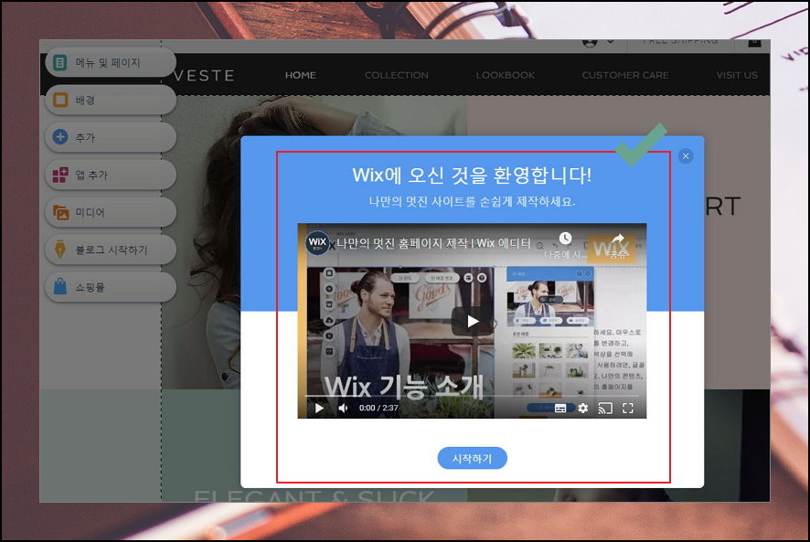 5. 영상으로 기본 사용법 배워봐요. 템플릿을 선택하면 어느 정도 만들어진 홈페이지가 나타나요. Wix 기능 소개 동영상이 있사오니 처음 이용하는 분은 감상해보면 도움이 될 거에요.