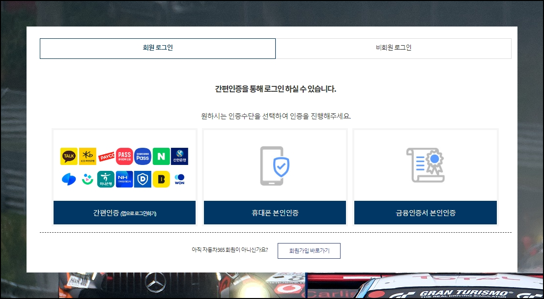 6. 간편한 로그인 절차로 시작해요. 사이트에서 차량조회 서비스를 진행하려면 로그인을 해야 하는데요. 굳이 회원가입까지 진행할 필요는 없습니다. 비회원으로 로그인을 할 수 있어요. 많이 사용하는 네이버나 카카오톡, 삼성패스를 통한 간편인증을 하면 됩니다. 이후부터는 정보 확인만 하면 되기 때문에 사용법을 마치도록 하겠습니다.