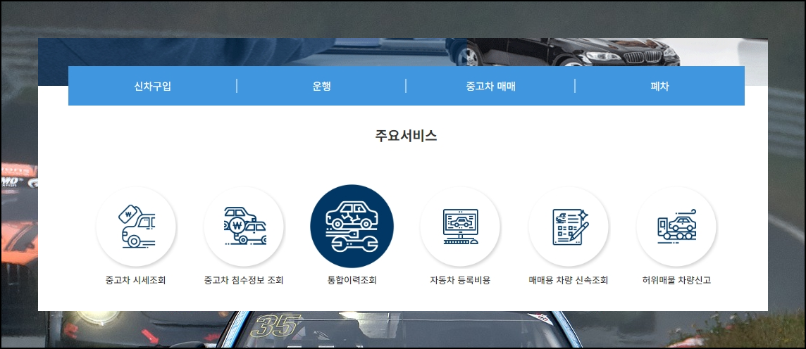 2. 메뉴를 선택해야 합니다. 사이트에 접속하면 신차구입, 운행, 중고차 매매, 폐차 메뉴가 있고, 그 아래에 주요 서비스가 있습니다. 차량조회를 하기 위해서는 주요 서비스에서 3번째 위치한 "통합이력조회"를 선택하면 됩니다.