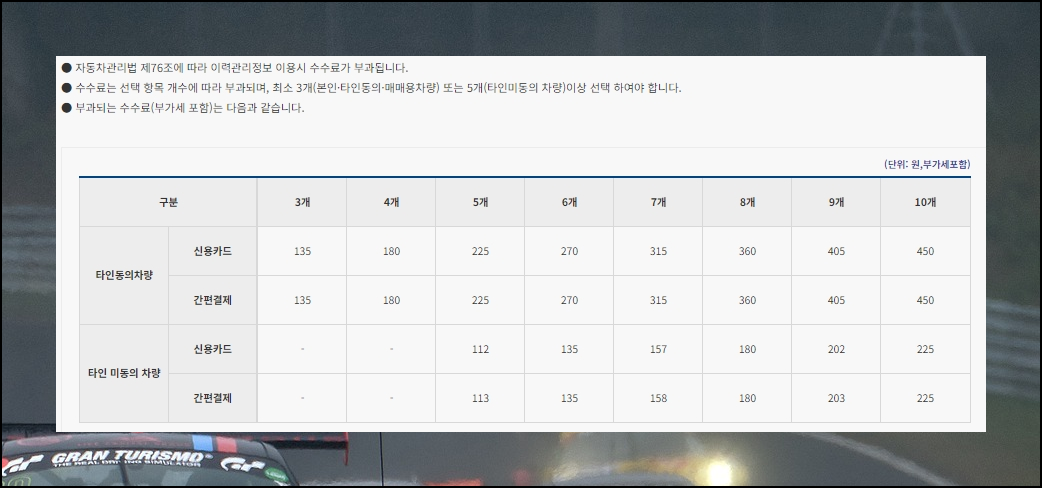 4. 비용과 결제 방식을 확인하세요. 수수료 결제는 신용카드와 간편결제 이렇게 2가지 방식으로 할 수 있는데요. 타인이 동의했을 경우와 그렇지 않을 경우에 따라 수수료 차이가 있습니다. 금액을 보면 알 수 있듯이 수수료는 꽤 저렴한 편인데요. 선택 항목 개수에 따라 부과가 되기 때문에 최소 3개에서 5개를 선택하여 차량조회를 진행해야 합니다. 참고로 부가세 포함 가격이에요.