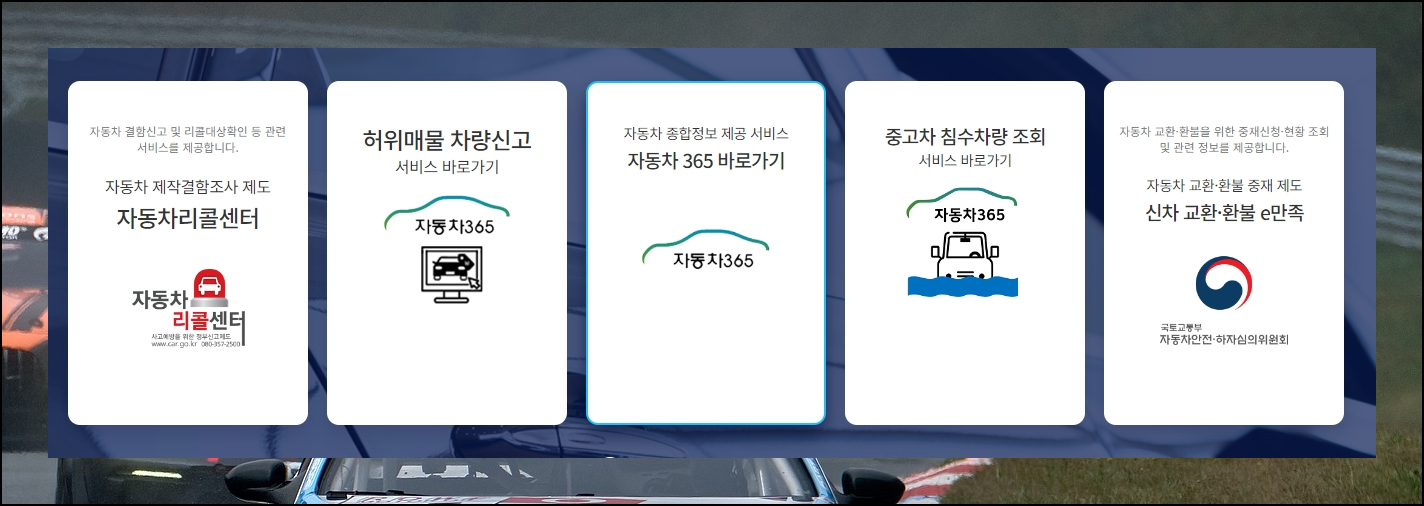 1. 공공기관에서 차량조회를 쉽게 할 수 있도록 서비스를 제공하는 사이트가 있습니다. 바로 자동차365 사이트인데요. 이곳의 경우 우리가 원하는 서비스 외에도 여러 가지 유용한 기능을 갖추고 있죠. 허위매물 신고, 신차 교환 및 환불에 대한 중재, 중고차 침수 정보 등 여러가지가 있습니다. 우리는 "자동차 종합정보 제공 서비스"를 선택하면 됩니다.