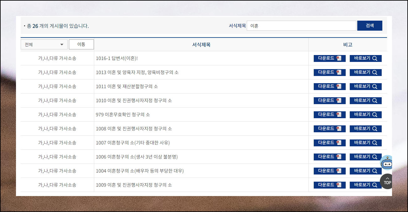 법률서식 페이지에서 검색창이용하여 찾고자 하는 것을 검색해보세요. 그러면 여러 가지의 관련 서식이 나타납니다. 보통 대표적인 서식으로는 "신청서"가 있는데요. 검색 결과에 포함되어 있으니 그걸 선택해주세요. 이렇게 "이혼서류는 어디서구하는가요"에 대한 답변은 쉽게 해결이 되었네요.
