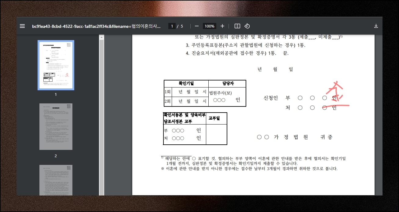 합의가 된 경우라면 이혼서류는 주로 "신청서와 첨부서류"로 구성됩니다. 신청서는 가정법원에 비치되어 있고, 첨부해야 하는 문서의 경우 대부분 관공서에서 발급 받을 수 있는데요. 정해진 양식이 있기 때문에 빈 칸을 채워 넣기만 해도 될 정도로 쉽게 작성이 가능합니다. 제가 바로 아래에 최신 양식을 첨부했어요.