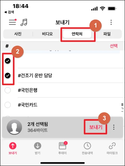 아래와 같이 시작 화면에서 바로 보내고자 하는 데이터를 선택할 수 있게 되어 있는데요. 화면 상단에 있는 메뉴에서 연락처를 선택한 후, PC 또는 다른 기기로 보낼 대상을 모두 선택해 주세요. 그럼 화면에서 오른쪽 하단 부분에 "보내기" 버튼이 나타납니다. 해당 버튼을 눌러 주세요.