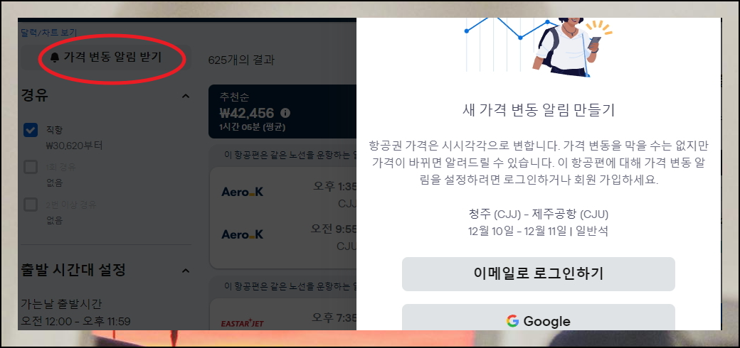 원하는 가격대의 청주 제주 항공권을 못 찾으셨다면 가격 변동 알림 서비스를 활용해보세요. 청주 제주 항공권 가격이 하락할 때마다 알림을 받아볼 수 있어서 적절한 시기에 예약할 수 있습니다.