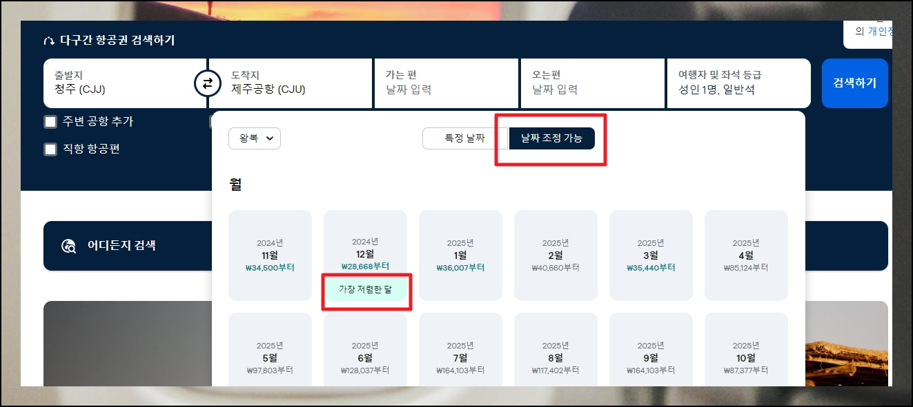 첫 화면에서는 필수적인 여행 정보를 입력해야 합니다. 출발지와 도착지를 각각 청주와 제주로 지정하고, 원하시는 날짜를 선택하세요. 특히 "날짜 조정 가능" 조건으로 선택하면 좀 더 경제적인 선택지를 만나볼 수 있어요. 이를 통해 전체 달의 가격 흐름을 한눈에 파악할 수 있기 때문이에요. 주말과 평일의 가격 차이도 확인할 수 있어 유용합니다.