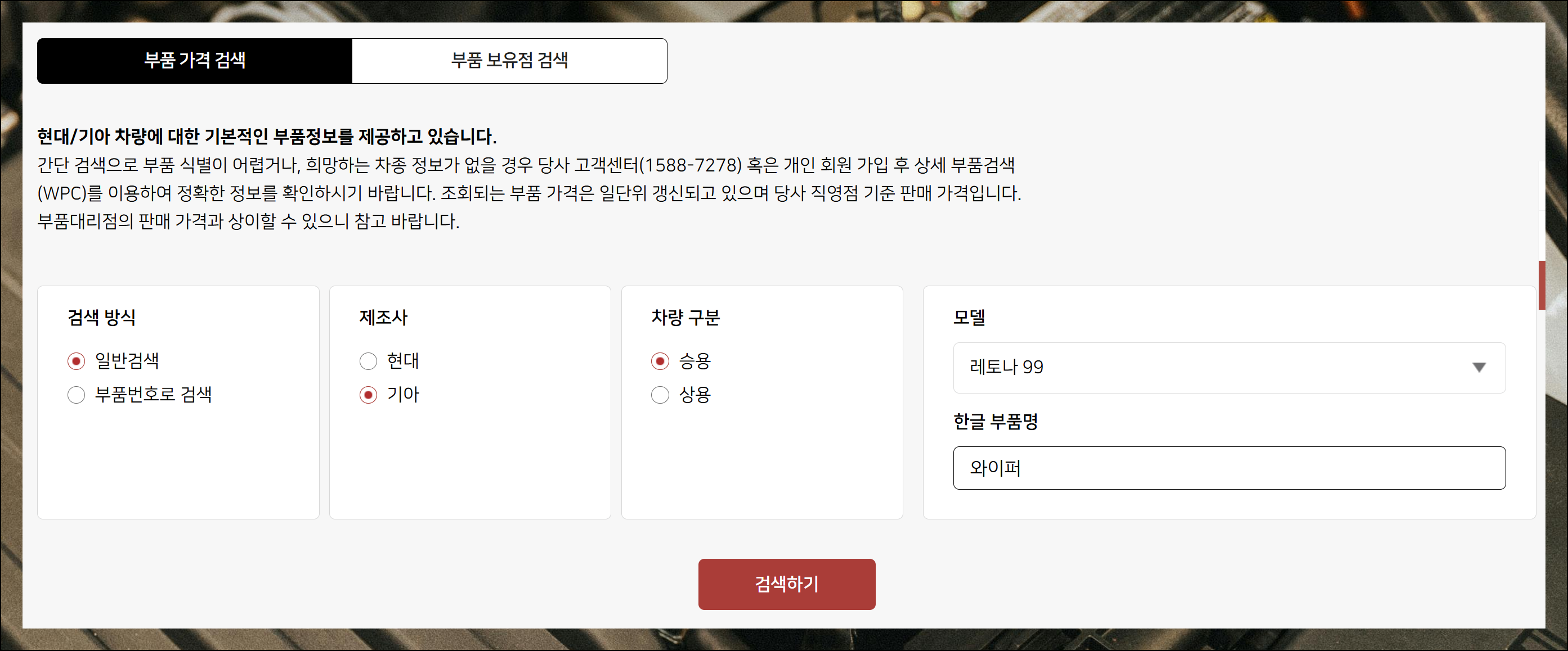 드디어 실제 제품 검색이 가능한 화면이 나타납니다. 기아차뿐만 아니라 현대차 부품도 검색할 수 있어요. 검색 방식부터 시작해서 제조사, 차량 구분, 모델, 한글명 순으로 입력하시면 됩니다. 자동차 부품명은 일부만 입력해도 조회가 가능합니다.