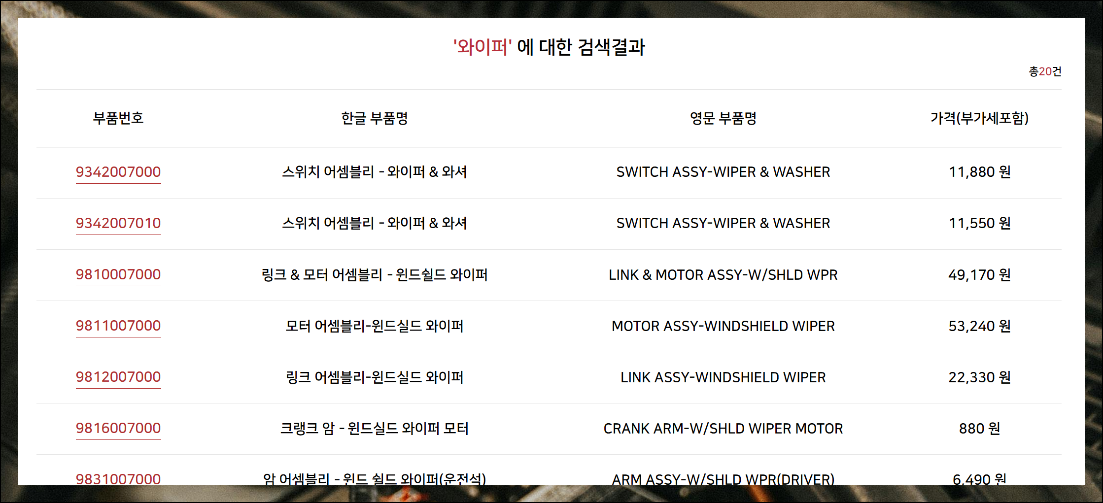 와이라는 키워드로 검색해보니 20개의 기아 제품이 검색되었습니다. 각자 왼쪽에는 빨간색으로 표시된 고유번호가 있는데요. 이를 클릭하면 더 자세한 정보를 확인할 수 있어요. 자동차 부품 조회 시스템을 통해 원하는 정보를 쉽게 찾을 수 있습니다.