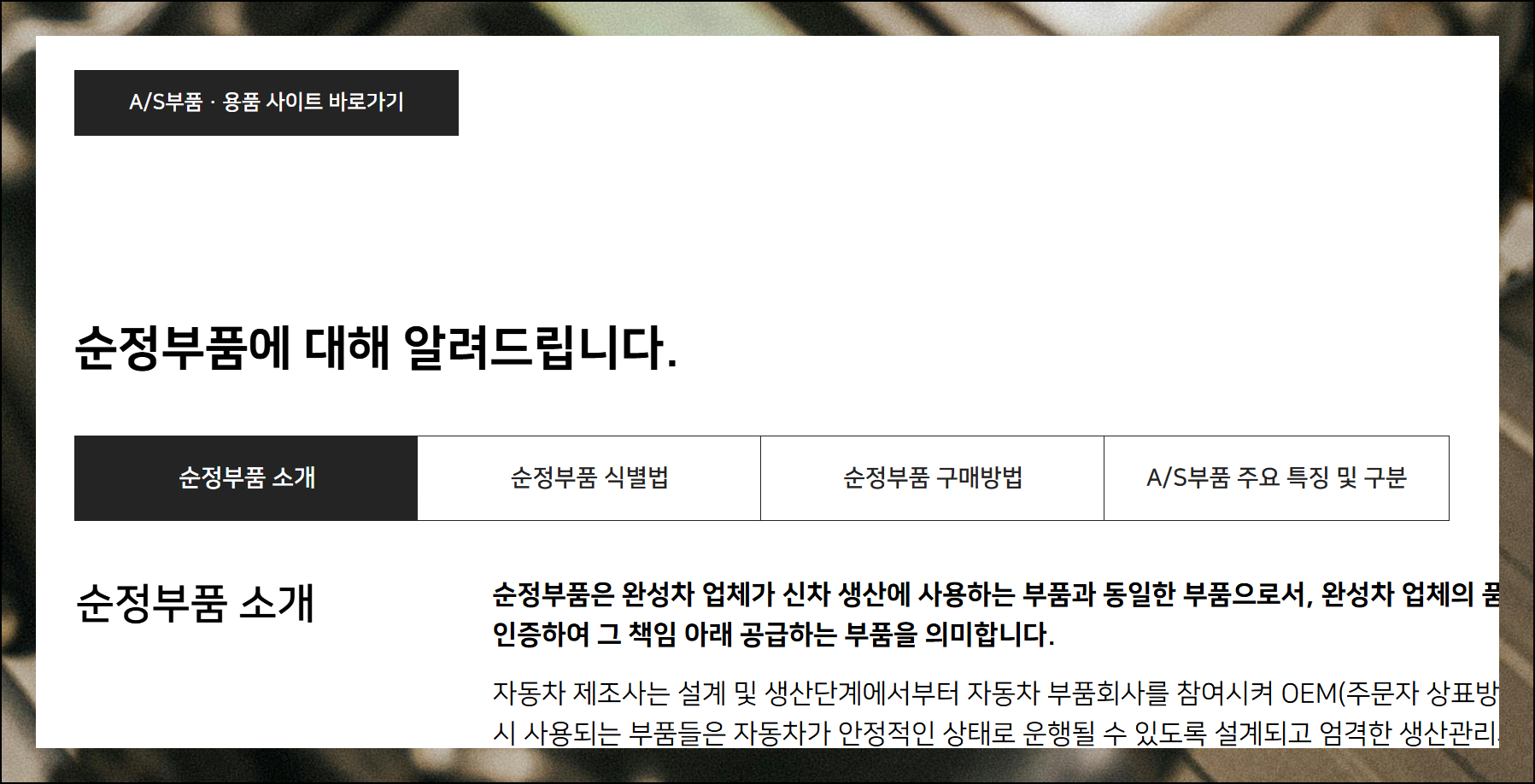 AS용품 및 부품 사이트로 이동하는 버튼이 보일 거예요. 이 버튼을 클릭하면 기아제품에 대한 정보 페이지로 연결됩니다. 자동차 순정 제품에 관한 상세 정보도 함께 제공되니 참고하시면 좋습니다.