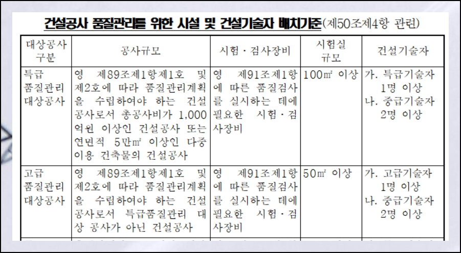 초급공사는 품질시험계획 수립이 필수인데요. 관리자는 최소 1명 이상 배치해야 합니다. 구체적인 기준은 시행령 하단부에서 확인할 수 있으니 참고하시면 되요. 품질관리자의 적절한 배치는 공사 진행의 효율성을 높이는 핵심 요소입니다. 현장의 특성과 규모에 맞는 배치 기준을 적용해야 해요.
