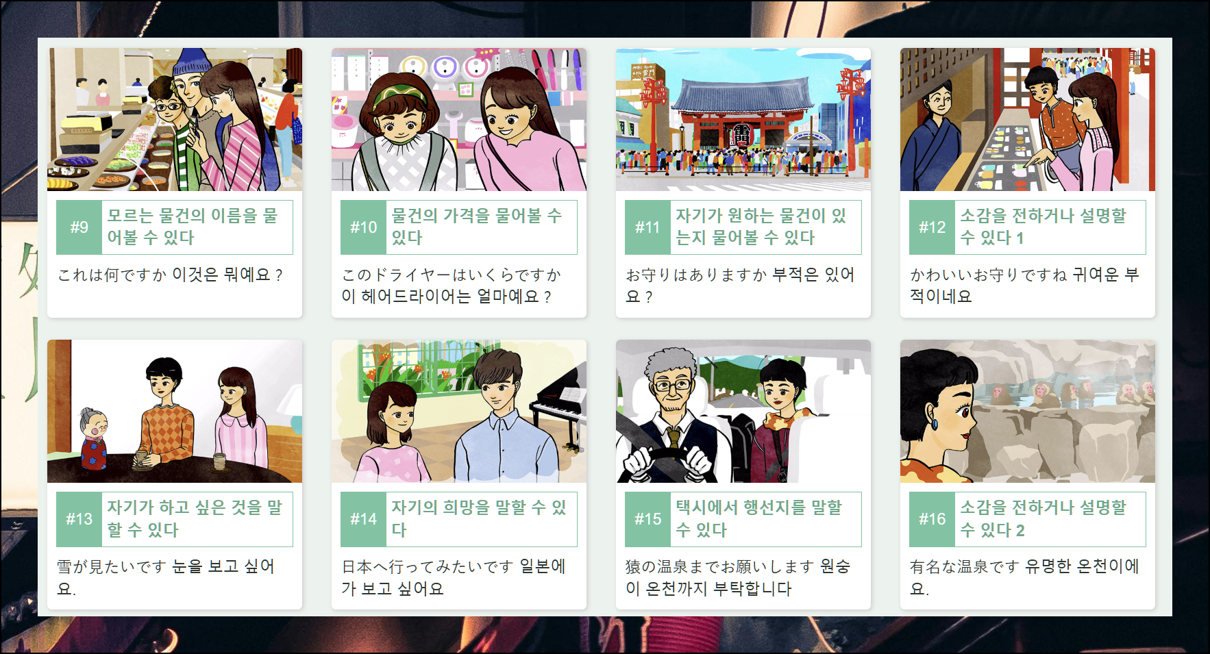 기초 회화에 필요한 어휘와 중요 표현들을 체계적으로 정리했습니다. 실전에서 활용할 수 있는 다양한 일본어 표현 방법을 공부해볼 수 있어요.