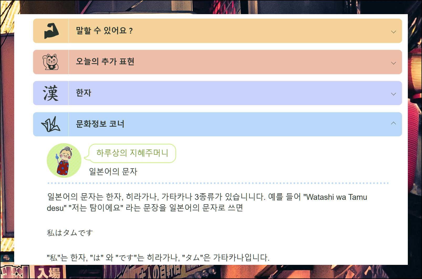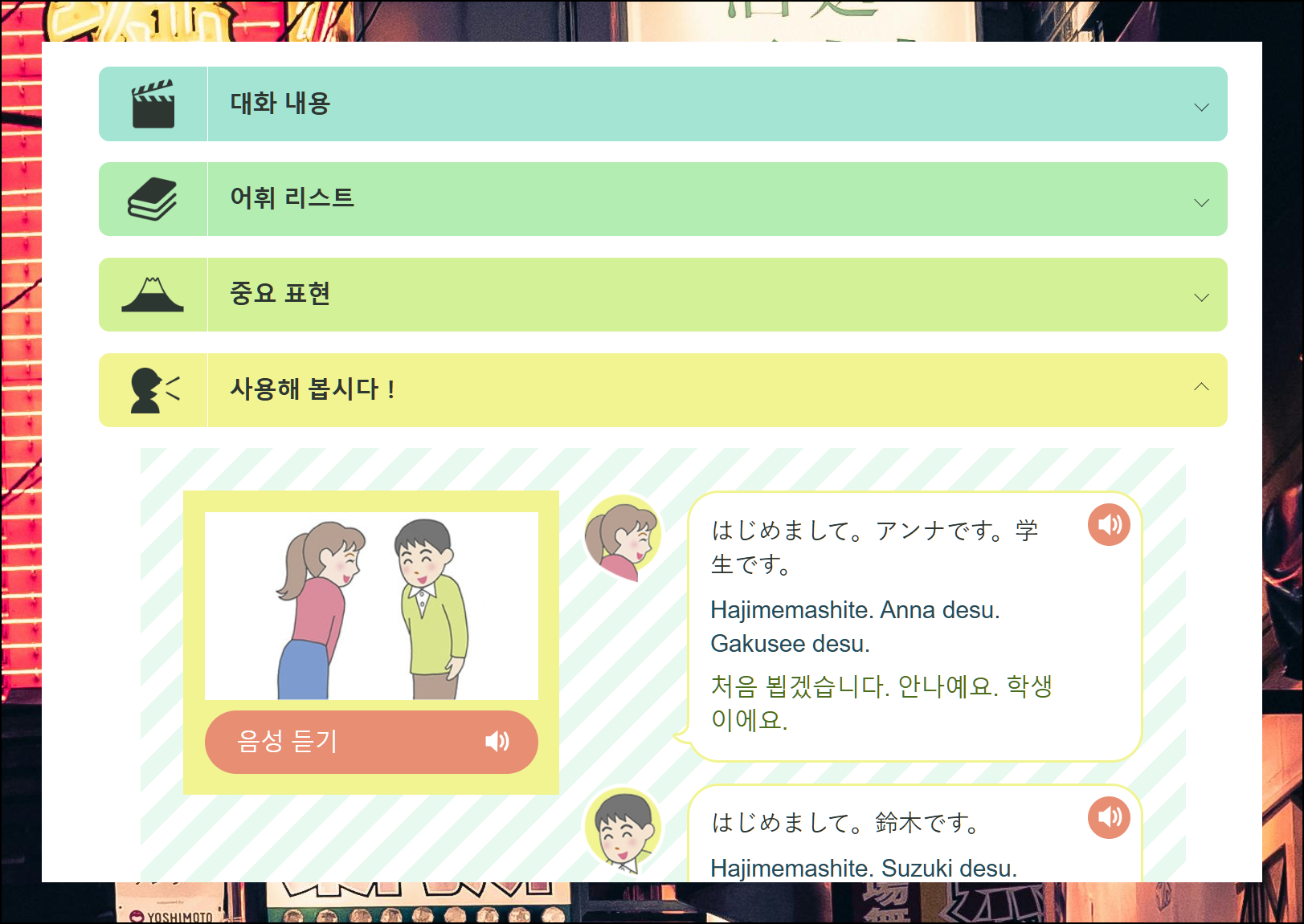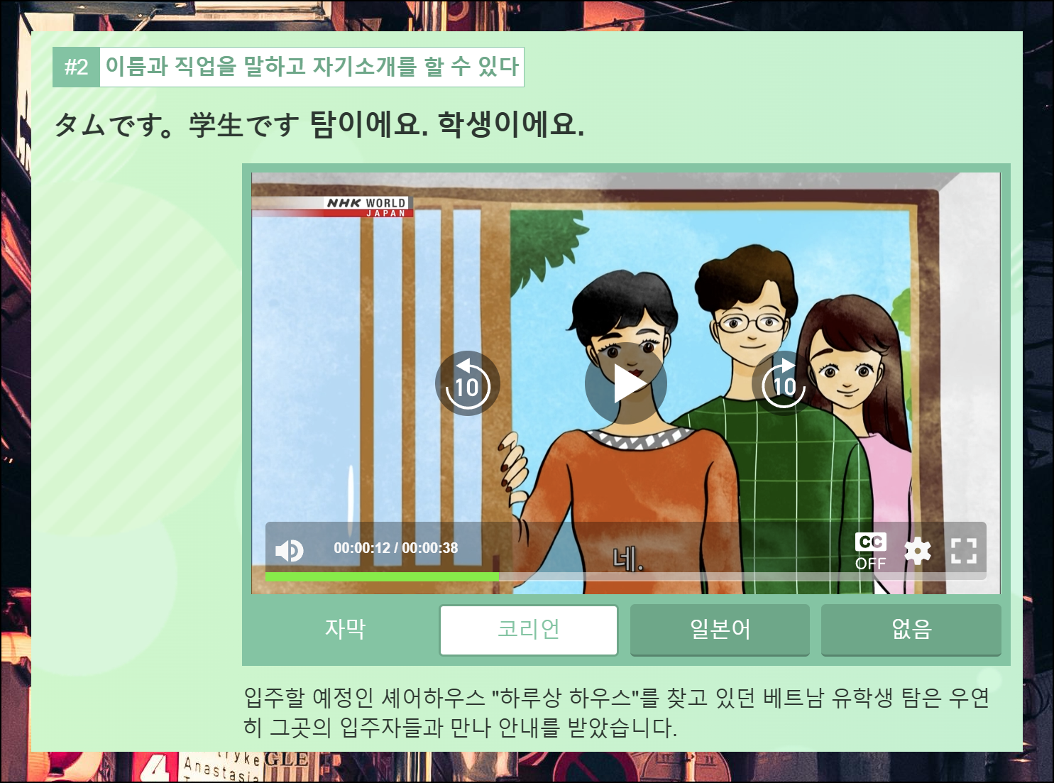 한국어 자막이 포함된 애니메이션으로 공부하는 즐거운 시간! 친근하고 재미있게 일본어를 배울 수 있도록 구성되어 있어요.