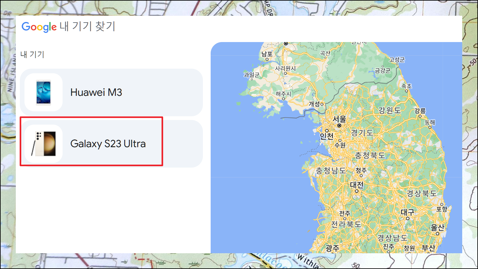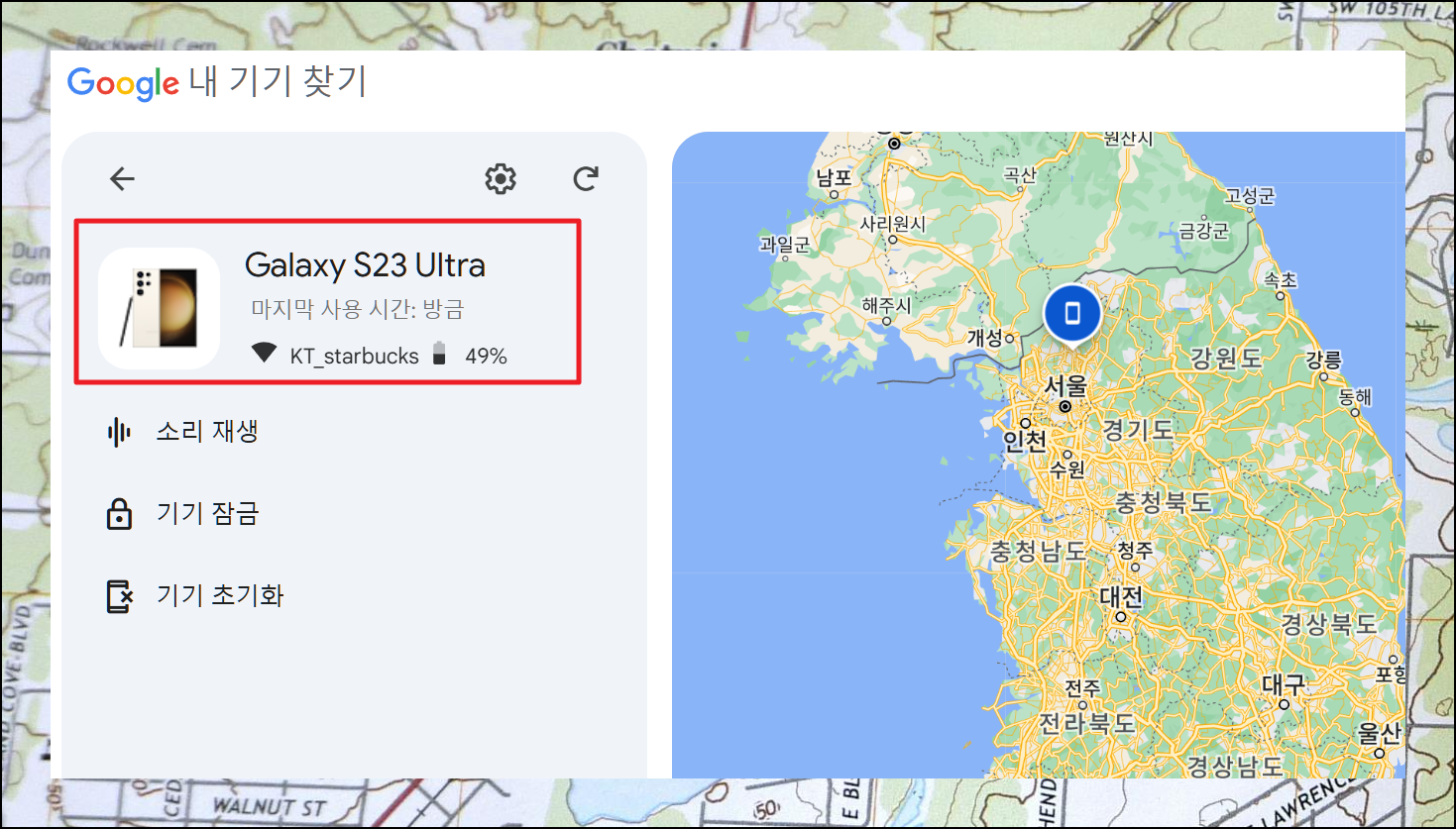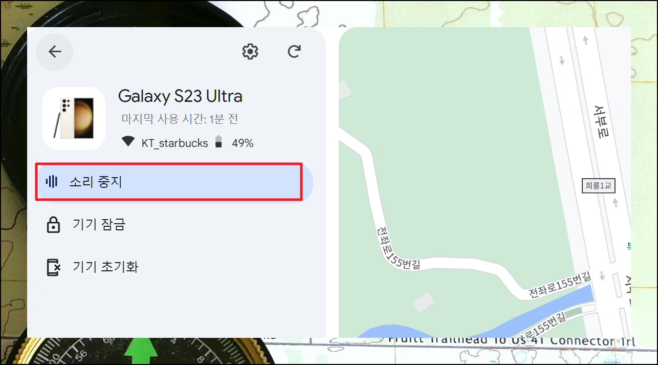 내 기기 찾기 사이트에 접속해서 구글 계정으로 로그인하면 등록된 모든 기기 목록이 나타납니다. 분실폰을 선택하면 기종명과 배터리 잔량, 연결된 와이파이 정보가 표시되고 지도상에 현재 위치가 나타나요.