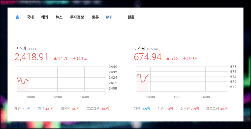새롭게 열린 사이트 메인 화면에서는 국내 주식시장의 실시간 흐름을 한눈에 볼 수 있어요. 우리나라를 대표하는 코스피와 코스닥 지수와 함께 투자자별 매매 동향을 파악하실 수 있습니다. 이러한 데이터는 투자 타이밍을 잡는 데 매우 유용하죠.