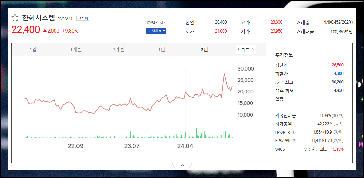 화면 아래쪽에서는 더욱 자세한 기업 정보를 찾을 수 있어요. 코스피200에 속한 "한화시스템"의 현재가부터 공시까지 보기 좋게 리스트화 되어 있는 정보가 나타납니다. 특히 기업 개요와 재무 분석 자료는 투자 판단에 큰 도움이 되죠.