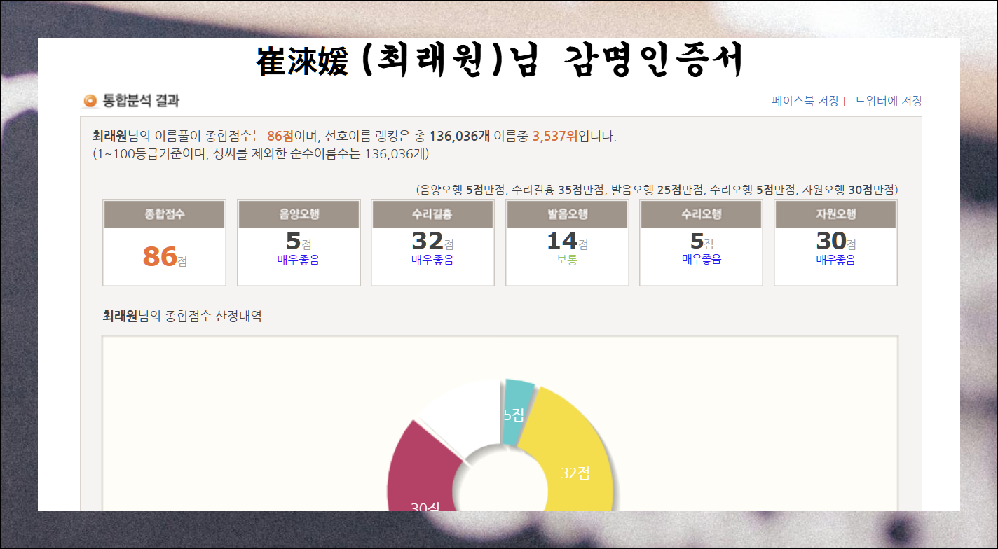 감명 인증서를 통해 우리가 선택한 여자 아이의 성명에 대한 선호도를 알 수 있어요. 예쁜 것일수록 선호도가 높게 나타나죠. 성명학 정보도 자세히 볼 수 있으니 참고하세요. SNS에 저장해두면 나중에도 찾아보기 좋아요.