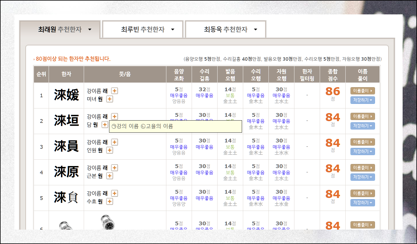무료로 이용할 수 있는 작명 사이트에서는 300개가 넘게 추천을 해줘요. 게다가 성명학과 사주까지 고려한 맞춤형 한자 추천까지 받아볼 수 있습니다.