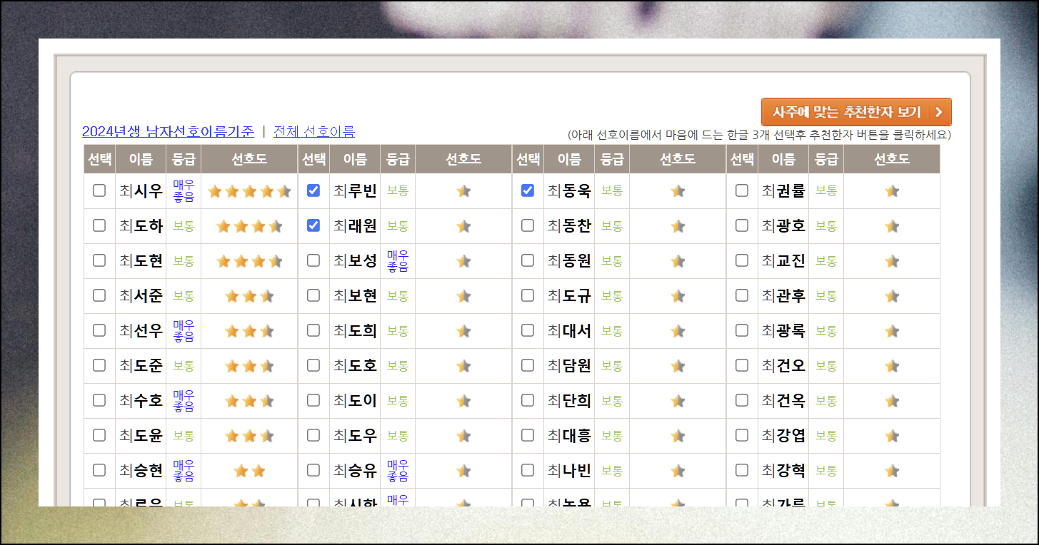 300개의 여자 아이 성명으로 된 모음이 나타나면 성명학 등급과 선호도를 확인해보세요. 이 두 가지를 기준으로 마음에 드는 성명 3개를 고르면 됩니다. 그다음 사주에 맞는 한자도 추천받을 수 있어요.