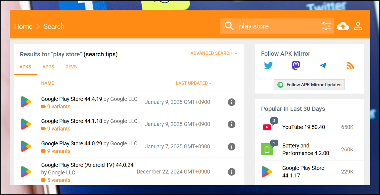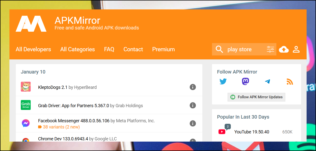 무료로 APK 파일을 제공하는 대표적인 사이트는 apkmirror입니다. play스토어뿐만 아니라 다양한 앱들의 APK 파일을 설치할 수 있어요. 안전하게 다운로드할 수 있는 곳이니 안심하고 이용하세요.