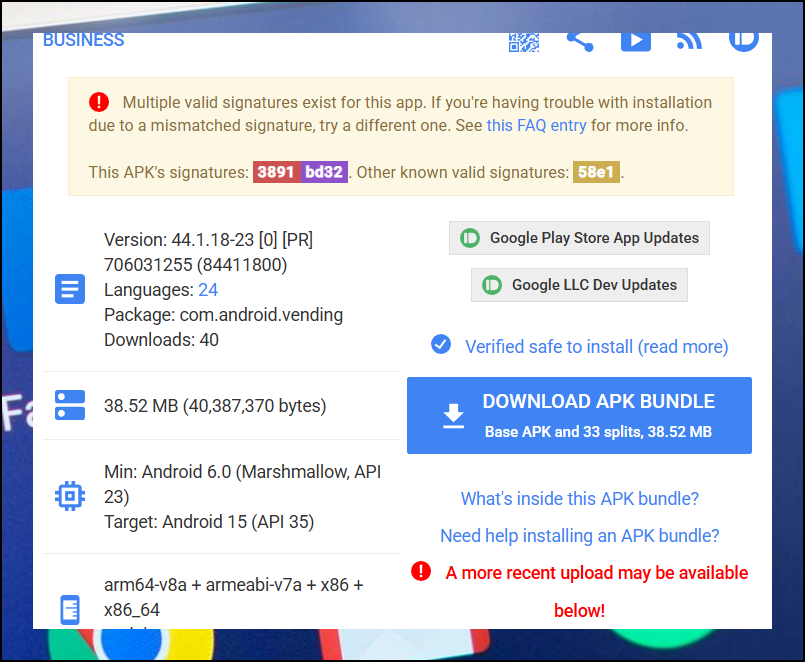 상세 정보 페이지에서 가장 중요한 것은 안드로이드 버전입니다. MIN은 최소 사양, Target은 권장 사양을 의미해요. 권장 사양에 맞추는 것이 좋습니다. play스토어와 기기의 호환성을 확인 후 Download APK 버튼을 누르세요.