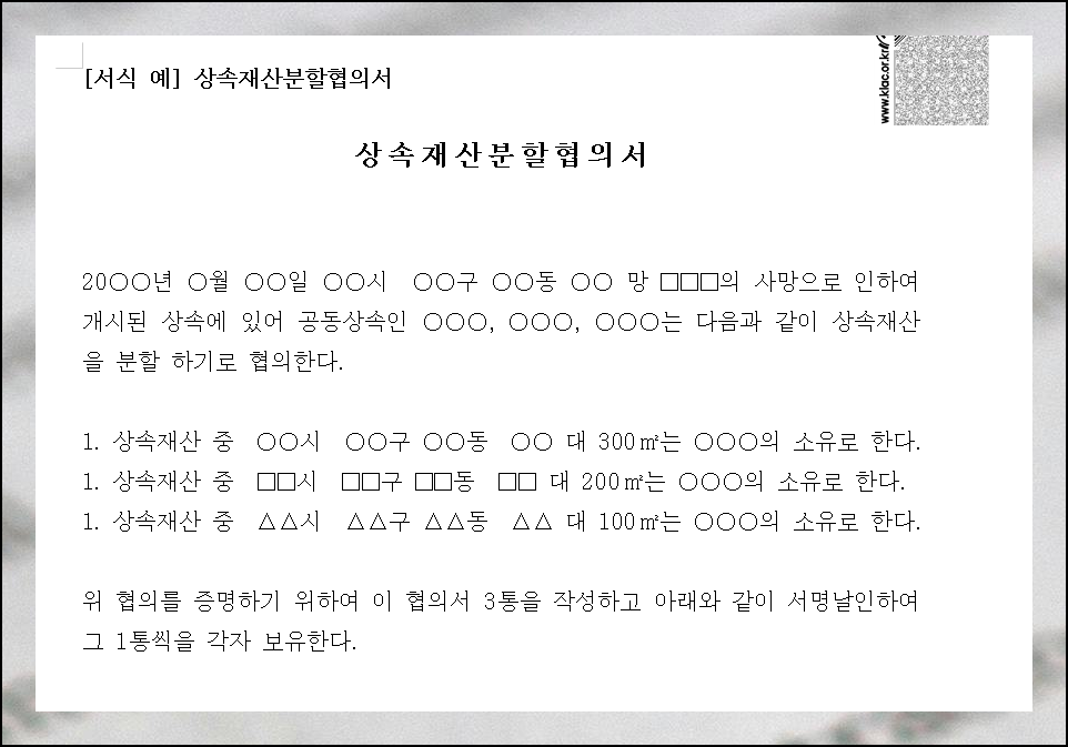 공공기관에서 받은 양식으로 신뢰할 수 있어요. 상속재산을 나눌 때 꼭 필요한 분할협의서인데, 서류 작성에서 가장 중요한 건 정확성이에요. 구체적으로 내용을 채우고, 도장도 정성스럽게 찍어야 해요. 안전하게 상속을 마무리하려면 참여하는 분들이 각자 한 부씩 보관하는 것이 좋습니다. 양식 다운로드는 첨부파일을 확인해주세요.