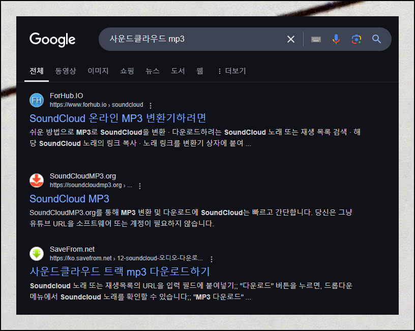 사운드클라우드에서 마음에 드는 곡을 찾았다면 다운받는곳인 mp3 변환 사이트를 이용해보세요. 다음과 같이 간단한 검색을 통해 찾을 수 있는데요. 대부분 무료로 이용 가능하며 누구나 쉽게 다운로드할 수 있습니다. 어렵지 않으니 걱정하지 마세요.