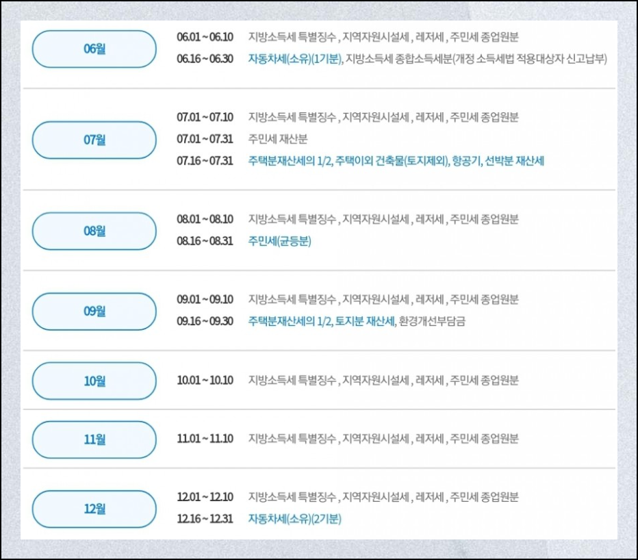 자동차세는 일 년에 두 번, 6월과 12월에 납부합니다. 정확히는 6월 16일부터 30일까지, 12월 16일부터 31일까지가 납부 기간이에요. 미리 1년치를 한번에 완납하는 '연납'을 활용하면 할인 혜택도 있답니다. 2025년 1월에 연납하면 10%, 3월은 7.5%, 6월은 5%, 9월은 2.5% 할인을 받을 수 있어요. 처음 차를 소유하셨다면 연납에 대한 납부 일정도 꼭 기억해두세요.