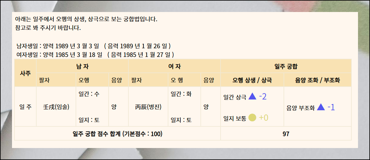 이곳에서도 생년월일 기반의 궁합 서비스를 체험할 수 있어요. 다채로운 인연에 대한 심층적인 해석이 가능합니다.
