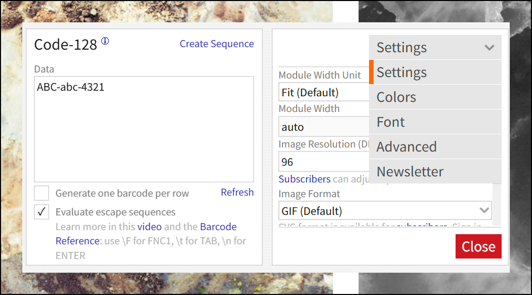 화면 오른쪽 상단의 톱니바퀴 아이콘을 클릭하면 'Setting', 'Colors', 'Advanced' 세 가지 메뉴가 표시됩니다. 이 프로그램 기능들을 통해 코드의 크기, 색상, 기울기 등을 자유롭게 조정할 수 있어요. 원하는 대로 수정한 후 'Close' 버튼을 누르면 변경사항이 즉시 적용됩니다.