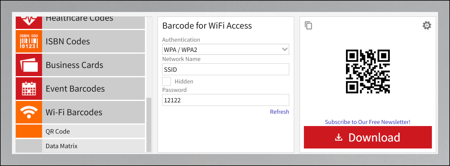 널리 사용되는 QR코드도 쉽게 제작할 수 있어요. 예를 들어 WIFI 정보를 담은 QR을 생성해보세요. 왼쪽에서 'QR Code'를 선택하고, 중앙의 'SSID'와 'Password' 항목에 와이파이 이름과 비밀번호를 기입하면 됩니다. 여기서 만든 QR코드 또한 이미지 파일로 즉시 다운로드 받을 수 있습니다.