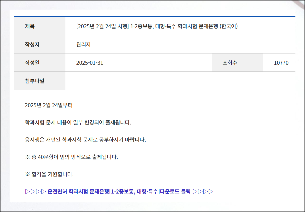 1종, 2종, 원동기에 대한 운전면허 필기시험 문제자료 다운로드 방법을 소개해드렸습니다. 한 번에 합격하지 못하면 매번 응시료가 발생하기 때문에 비용 부담이 돼요. 시간 낭비도 추가됩니다. 그러니 해당 자료를 제대로 활용하여 한 번에 통과하시길 바랍니다.
