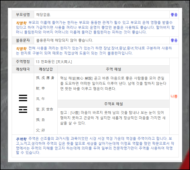 이름에 사용하면 안 되는 한자가 있는데, 사주닷컴에서는 불용한자 활용 여부를 간편하게 점검할 수 있어요. 부모 성명과의 조화도 성명학적으로 진단해주고, 주역학 기반의 획수 산출 결과도 제공합니다.