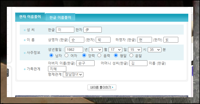 사주닷컴의 한자 이름 분석 서비스 활용법을 알려드릴게요. 성명을 한자까지 모두 기입하고, 생년월일, 태어난 시각, 성별 등 사주 정보를 정확히 작성합니다. 가족관계 내용까지 입력하면 더 정확한 결과를 얻을 수 있어요. 모든 항목을 채운 후 [내 이름 풀이하기] 버튼을 누르세요.