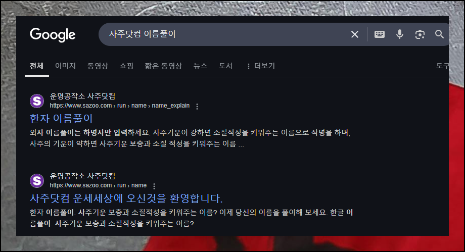 성명학 분석과 사주 데이터를 함께 볼 수 있는 '사주닷컴'이 있어요. 이 사이트에서는 불용한자, 이름의 사주 영향력, 자원오행, 81수리 등 다양한 해석을 제공합니다. 검색창에 "사주닷컴 이름풀이"만 입력하면 별도 메뉴 선택 없이 바로 해당 페이지로 이동할 수 있어요.